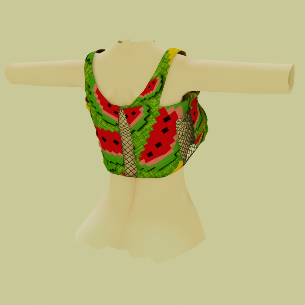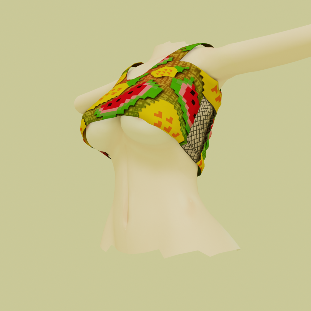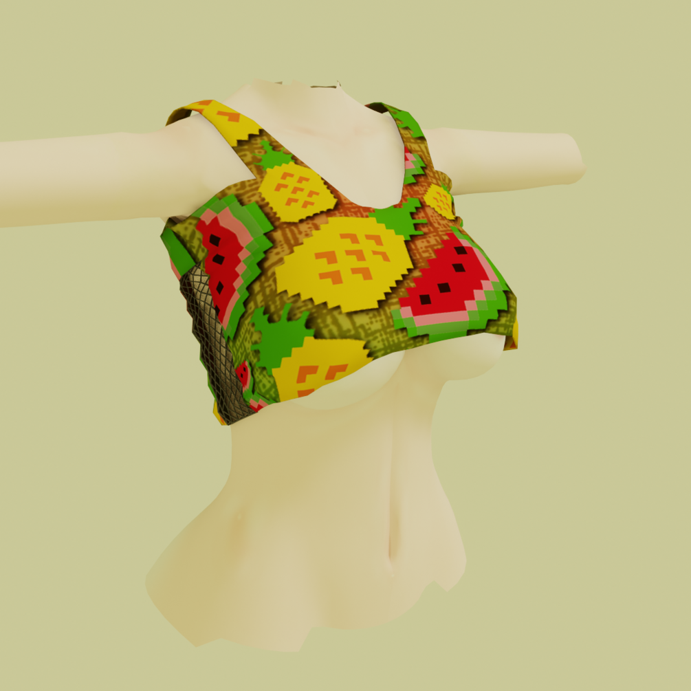 A sexy tropical top with watermelon and pineapple pixel art. This top has been hand sculpted and all textures have been embed in the .FBX files. You will get 2 versions. Optimized(1 sided mesh) and Normal(2 sided mesh).
